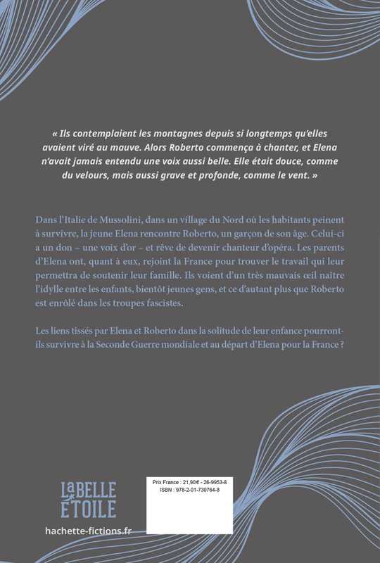 « Ils contemplaient les montagnes depuis si longtemps qu’elles avaient viré au mauve. Alors Roberto commença à chanter, et Elena n’avait jamais entendu une voix aussi belle. Elle était douce, comme du velours, mais aussi grave et profonde, comme le vent. »